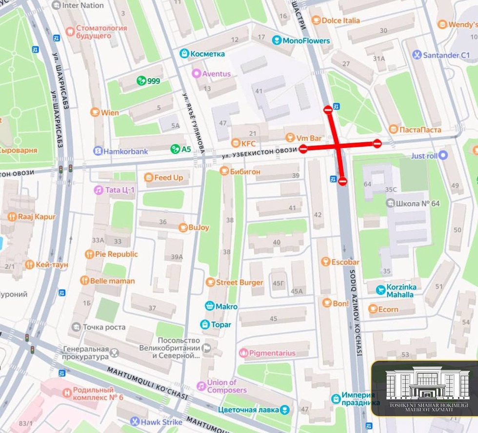 — Маҳтумқули кўчасидан ҳаракатланганда Содиқ Азимов кўчасининг “Ўзбекистон овози“ кўчасига туташ қисмидан қайрилиб олиш мумкин.