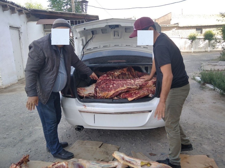 Вилоят ИИБ Жамоат хавфсизлиги хизмати Жамоат тартибини сақлаш бошқармаси Карантин тадбирларини таъминлаш бўлинмаси ҳамда вилоят ветернария ва чорвачиликни ривожлантириш бошқармаси ходимлари томонидан ўтказилган текширувда автомашина юкхонасидан 40 ёшли деновлик фуқаро С.Б.га тегишли бўлган ҳеч қандай ветеринария ҳужжатлари бўлмаган 315 кг йирик шохли мол гўшти олиб кетилаётганлиги аниқланган.