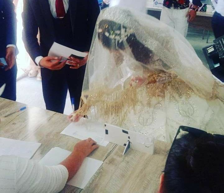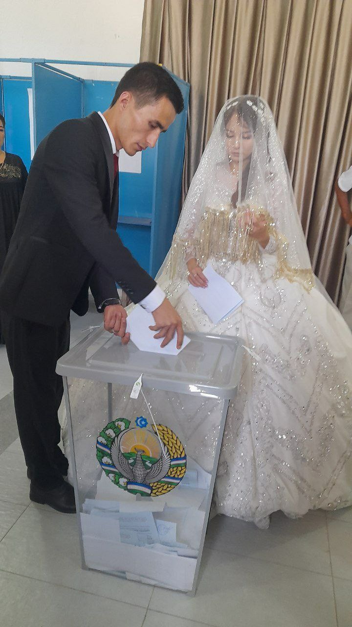 Оққўрғон туманидаги 377-сайлов участкасига бугун никоҳ тўйини ўтказаётган Азамат ва Чаросхон Суюновлар келиб, Президент сайловида овоз берди.