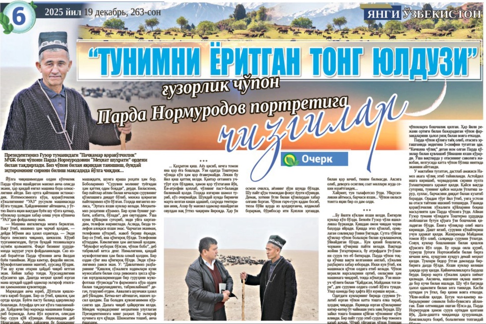 Президентимиз Ғузор туманидаги “Пачкамар қоракўлчилик” МЧЖ бош чўпони Парда Нормуродовни “Меҳнат шуҳрати” ордени билан тақдирлади. Биз чўпон билан яқиндан танишиш, бундай эҳтиромнинг сирини билиш мақсадида йўлга чиқдик...