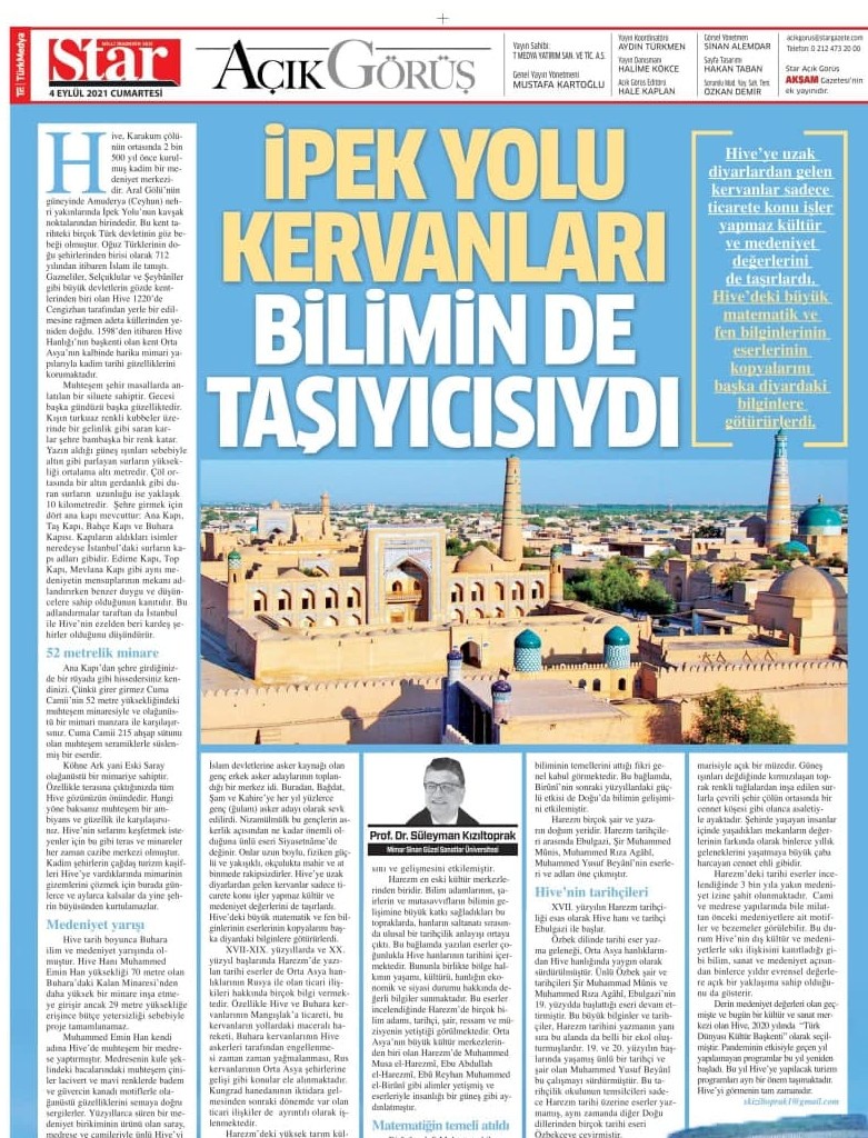 Мақола муаллифи Меъмор Синон номидаги Гўзал санъатлар университети профессори Сулаймон Қизилтупроқ бой тарих ва маданий меросга эга Хива шаҳри тўғрисида чуқур таҳлилий фикрларни баён қилган. Шунингдек, Кўҳна Aрк, яъни Эски Сарой, ажойиб меъморчиликка эга шаҳарга салобат қўшиб турган Муҳташам Жума масжиди, Мовароуннаҳрдаги Хива ва Бухоро ўртасида азалдан бўлиб келган илм-фан ва маданиятлар беллашуви, Буюк ипак йўли ривожига улкан ҳисса қўшиб келган, Хоразм минтақасининг маркази бўлган кўҳна маконнинг Ипак йўли бўйлаб саёҳат қиладиган карвонлар учун муҳим нуқталардан бири бўлган Хива савдо йўллари тўхталиб ўтгани алоҳида эътиборга лойиқ.