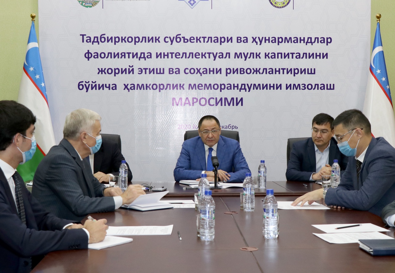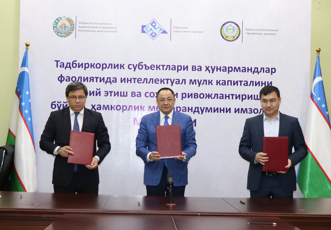 Бугун, 23 декабр куни Ўзбекистон Республикаси Савдо-саноат палатасида Тадбиркорлик субъектлари ва ҳунармандлар фаолиятида интеллектуал мулк капиталини жорий қилиш юзасидан Савдо-саноат палатаси, Интеллектуал мулк агентлиги ва “Ҳунарманд” уюшмаси ўртасида уч томонлама ҳамкорлик битими имзоланди.