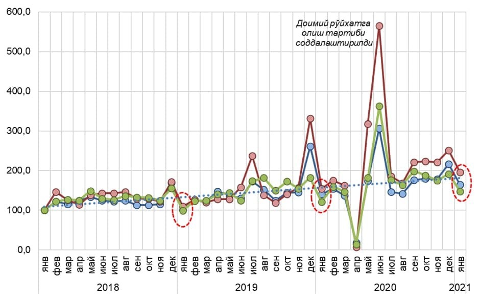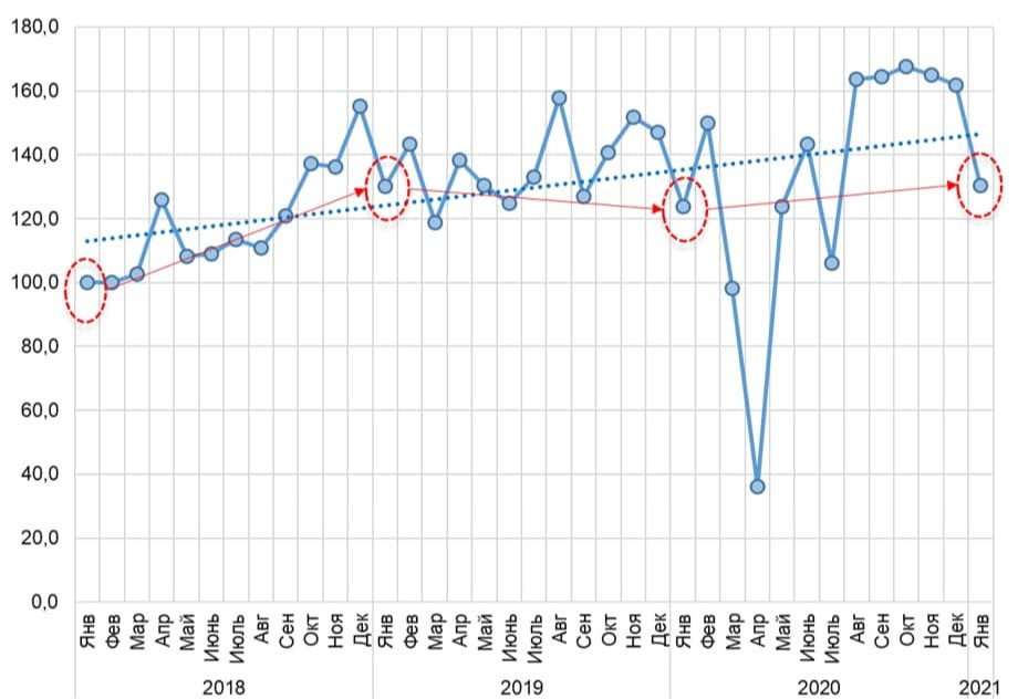 2021 йил январь ойида автомобиль бозорида аҳоли талаби 2020 йил январь ойига нисбатан 5,3 фоиз ошди. Автомобиль бозорида савдо динамикаси мавсумий характерга эга. Бу эса кўпгина омиллар билан изоҳланади (масалан, автомобиллар таклифининг камайиши, пул жўнатмаларининг камайиши). Одатда, ҳар йили январь ойида автомобиллар олди-сотдиси ўтган йил декабрь ойига нисбатан 16-19 фоиз камаяди.
