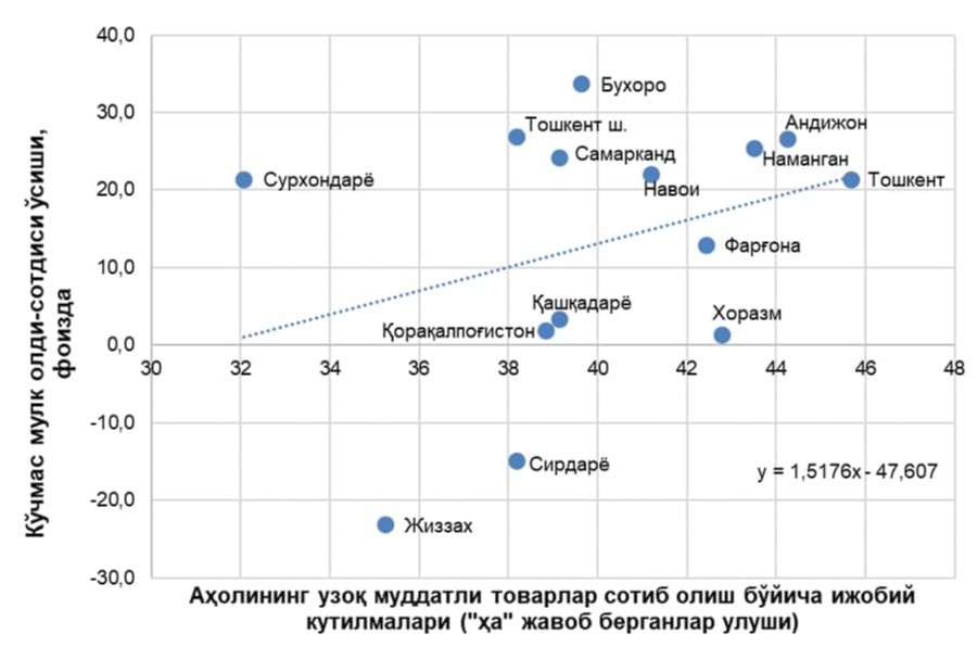 Марказ томонидан ҳар ойда истеъмолчилар кайфиятини акс эттирувчи сўров ўтказиб борилади. Жорий йил январь ойи учун ушбу сўров натижалари ва кўчмас мулк бозоридаги талаб ўзгариши таҳлили натижалари шуни кўрсатдики, аҳолининг узоқ муддатли товарларни сотиб олиш бўйича ижобий кутилмалари улушининг 1 фоиз ошиши кўчмас мулк олди-сотдилари сонининг 1,5 фоиз ўсишига олиб келади.