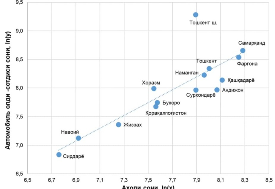 Таҳлил натижаларига кўра, ҳудудлар аҳолисининг 1 фоиз ўсиши автомобиллар олди-сотдисининг 1,1 фоиз ошишига олиб келмоқда.