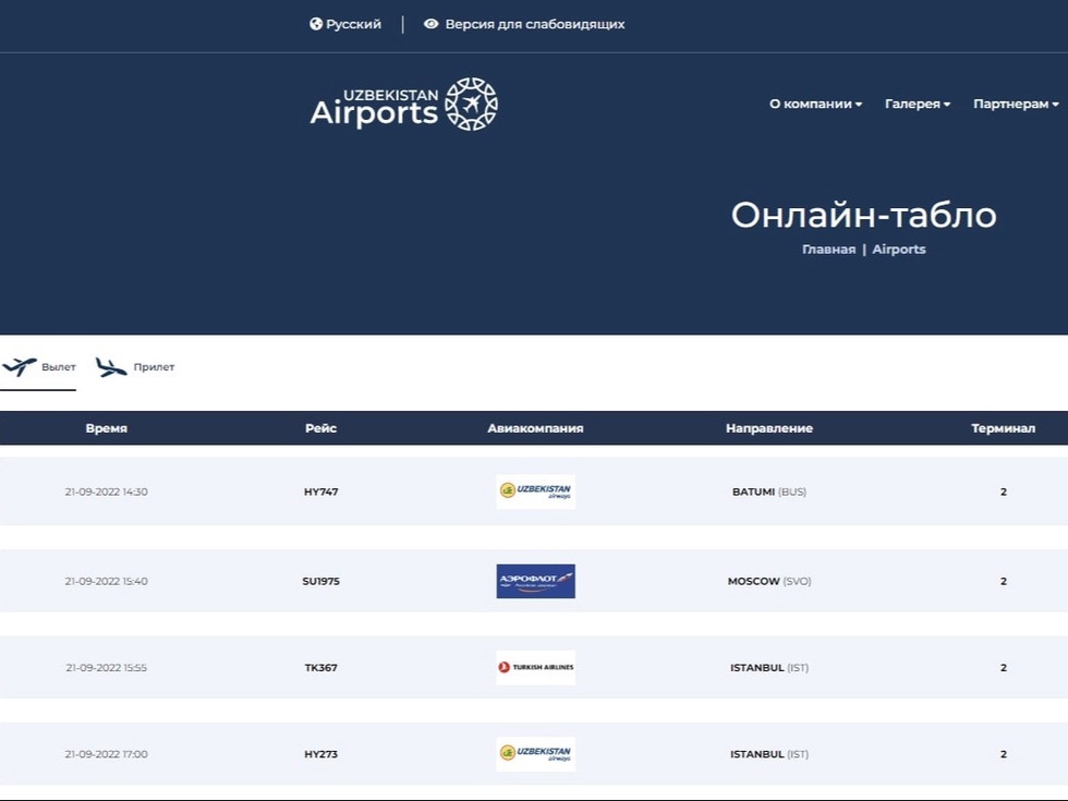 Uzbekistan Airports расмий сайти – www.uzbairports.uz орқали Ўзбекистоннинг барча 11 халқаро аэропортларида мунтазам халқаро ва ички рейсларнинг жўнаб кетиш/келишларини кузатиш имкони пайдо бўлди.