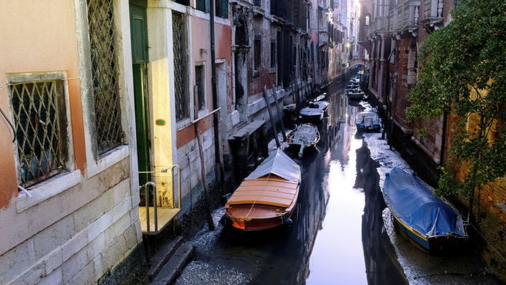 Венециядаги асосий сув йўли — Гранд-каналда сув ҳозирча бор. Бироқ унинг сатҳи ҳам анчагина пасайган.