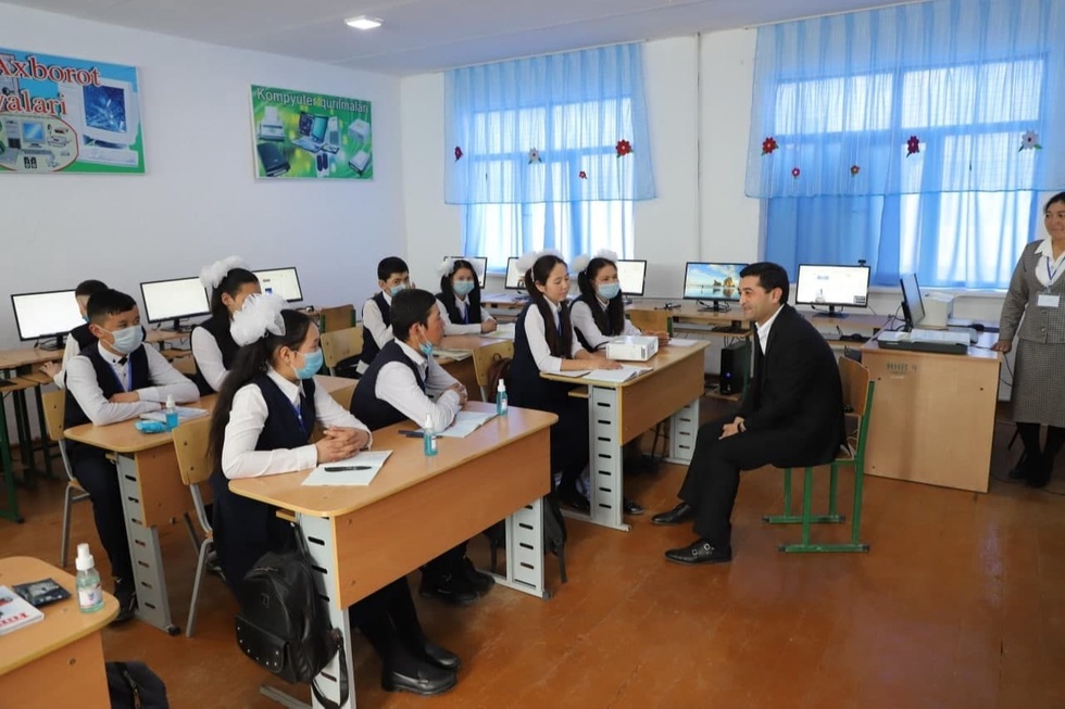 Вазир мактаб ўқувчилари билан суҳбатлашди. Уларнинг орзу-ўйлари, келажакда эгалламоқчи бўлган касблари ҳақида сўради ва ўқувчиларнинг билимини синовдан ўтказди.