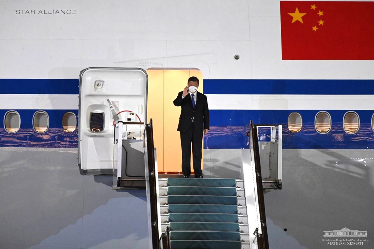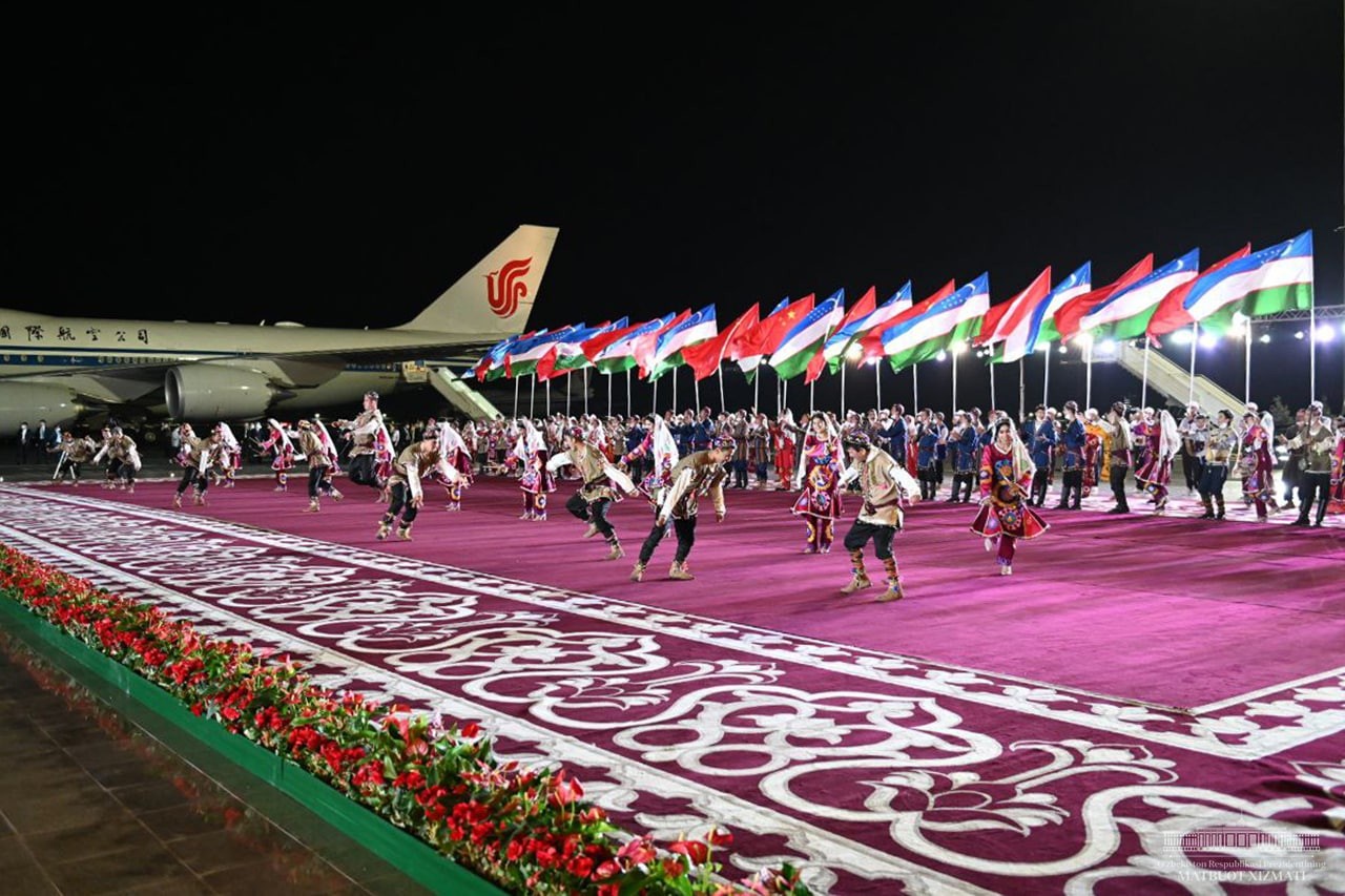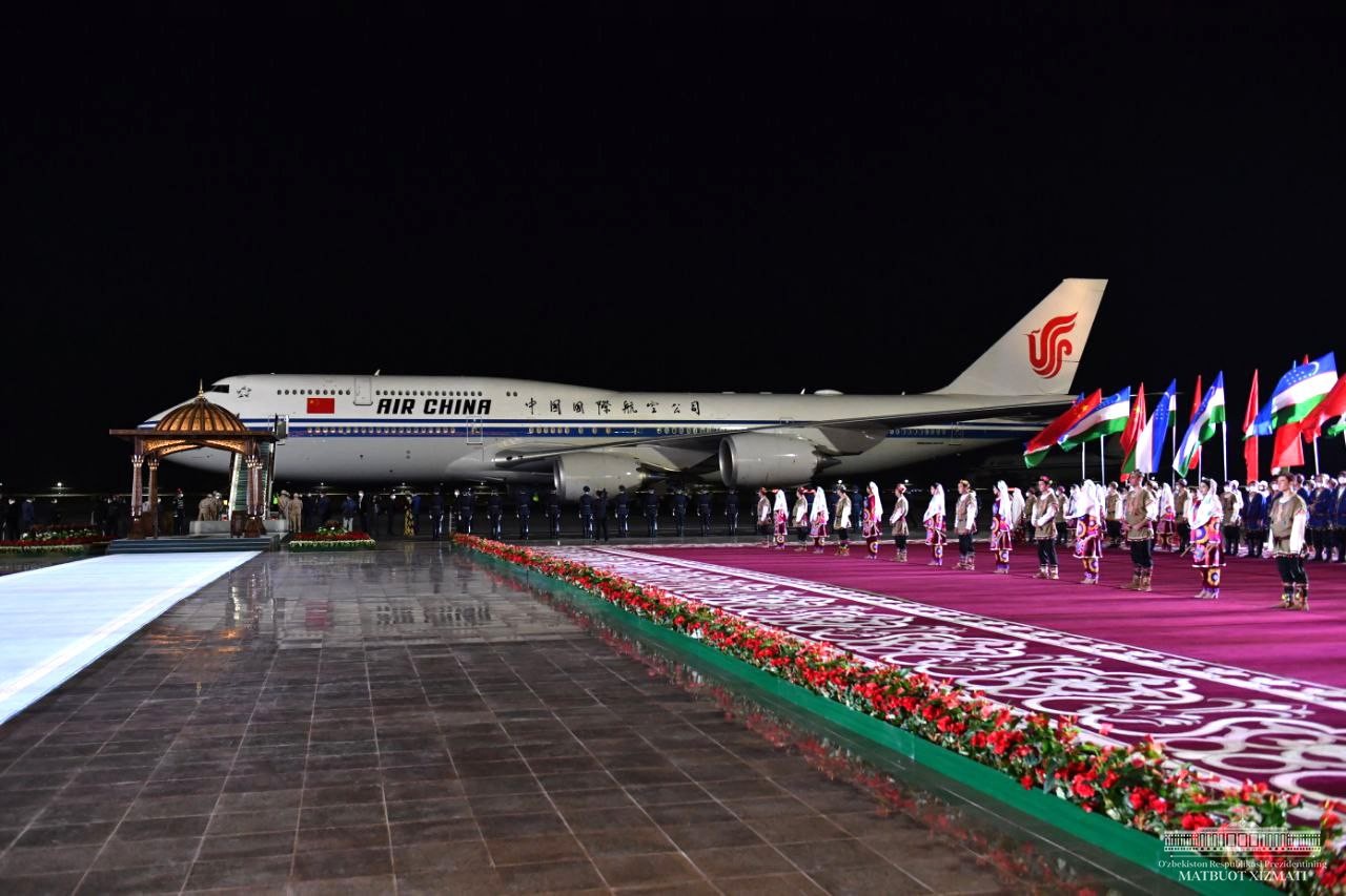 Самарқанд халқаро аэропортида Хитой етакчисини давлатимиз раҳбари кутиб олди.