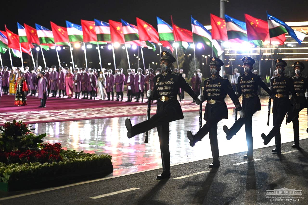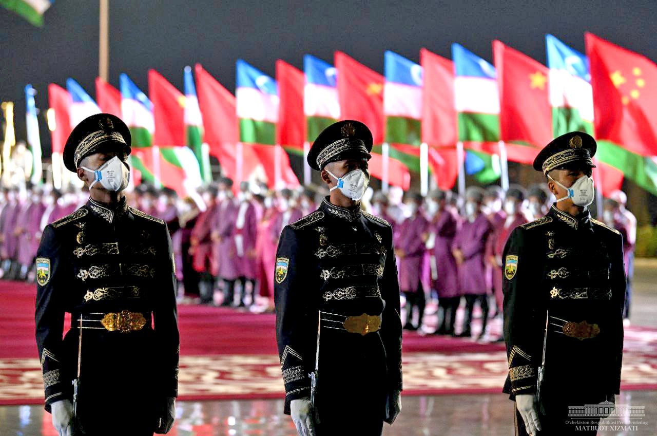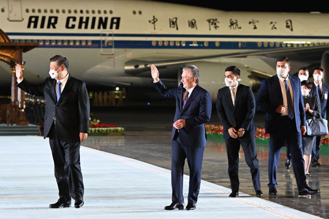Самарқанд халқаро аэропортида Хитой етакчисини давлатимиз раҳбари кутиб олди.