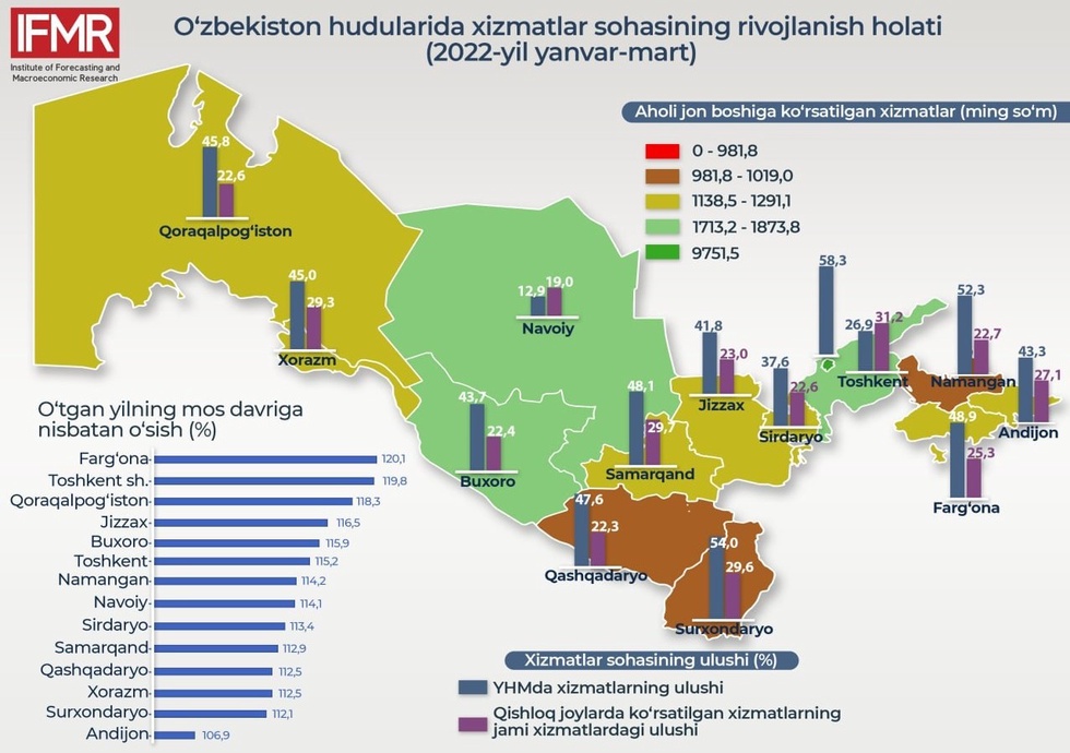 Институтдан маълум қилишларича, таҳлил натижаларига кўра 2022 йилнинг I чорагида мамлакат миқёсида хизмат кўрсатиш соҳасидаги ўсиш ўтган йилнинг шу давридагига нисбатан 15,9 фоизни ташкил қилган.