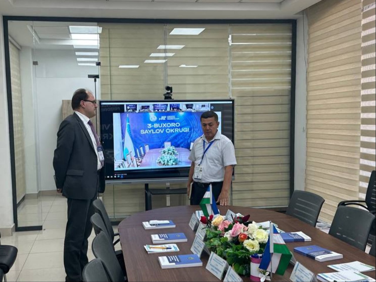 МДҲ кузатувчилари миссияси аъзолари Евгений Козяк ва Денис Варганов Нурафшон шаҳридаги 10-Тошкент вилояти округ сайлов комиссияси биносида бўлиб, ҳудудда амалга оширилаётган ишлар билан танишди.