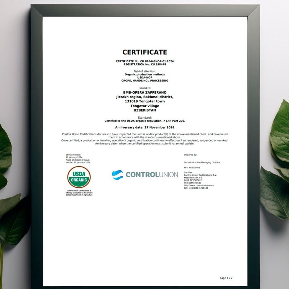 BMB Zaʼfaron бренди остида етиштирилаётган заъфарон маҳсулотининг экспорт ҳажмини ошириш ва унинг географиясини кенгайтириш мақсадида Control Union Certifications (Нидерландия) ташкилоти билан ҳамкорликдаги Euro Cert компанияси ёрдамида USDA organic сертификатини олиш бўйича ишлар якунига етди.
