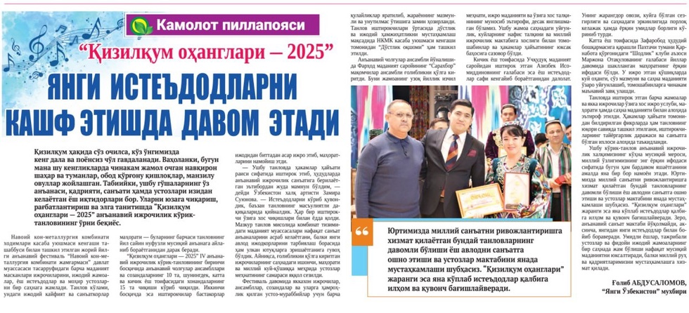 Ваҳоланки, бугун мана шу кенгликларда чинакам жамол очган навқирон шаҳар ва туманлар, обод қўрғону қишлоқлар, манзилу овуллар жойлашган. Табиийки, ушбу гўшаларнинг ўз анъанаси, қадрияти, санъати ҳамда устозлари изидан келаётган ёш иқтидорлари бор. Уларни юзага чиқариш, рағбатлантириш ва элга танитишда “Қизилқум оҳанглари – 2025” анъанавий ижрочилик кўрик-танловининг ўрни беқиёсдир.