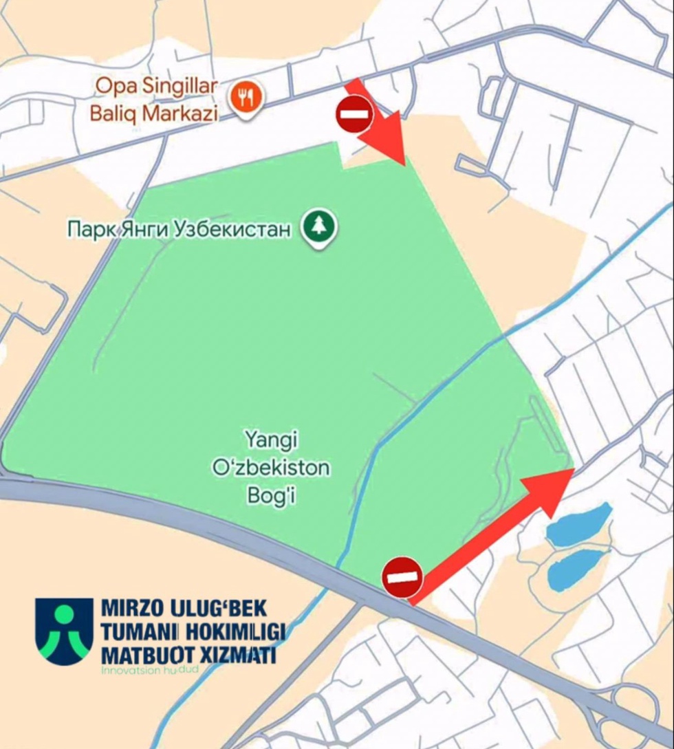 - Янги Ўзбекистон кўчасидан янги меҳмонхоналар томон ҳаракатланиш («Янги Ўзбекистон боғи» чегараси бўйлаб);