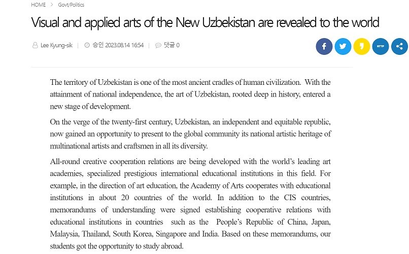 «Халқаро ҳамкорлик доирасида хорижий маданият ва санъат намояндалари билан учрашув ва мулоқотларнинг ўзига хос тизими яратилди. Мамлакатнинг кўплаб ижодкорлари халқаро анжуманлар, кўргазмалар, фестиваль ва кўрик-танловларда фаол иштирок этиб, нуфузли ўринларни эгаллаб, юксак давлат мукофотларига сазовор бўлмоқда. Ўзбекистонда санъат ривожига давлатимиз томонидан қаратилаётган эътибор туфайли ижодкорлар бундай муваффақиятларга эришмоқда», - деб ёзади «The Korea Post».