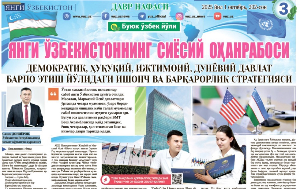 Шу ўринда яна бир фактга эътиборингизни қаратмоқчиман. Президентимизнинг БМТ Бош Ассамблеяси 80-сессиясидаги нутқи лингвистик таҳлил қилинди. Унга кўра, энг кўп “мақсад” сўзи (11 марта) ишлатилган. “Глобал” сўзи 8 ўринда келади. Шунга уйғун ҳолатда, Марказий Осиёнинг замонавий жараёнлардаги роли алоҳида таъкидланган. “Осиё” сўзи 7 марта, “Марказий” эса 6 марта қўлланилган.