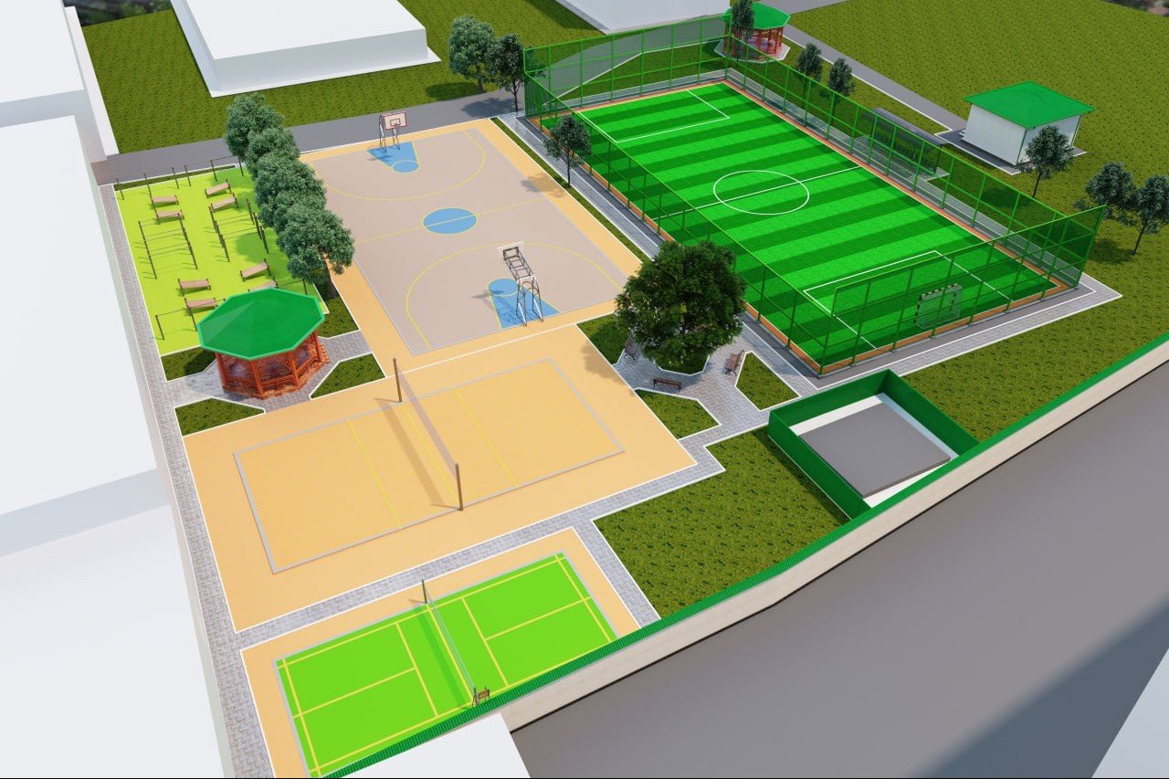 Ушбу спорт комплекси Мини-футбол, Баскетбол, Волейбол, Бадминтон, Гандбол ҳамда очиқ турдаги гимнастика майдончаларидан иборат.