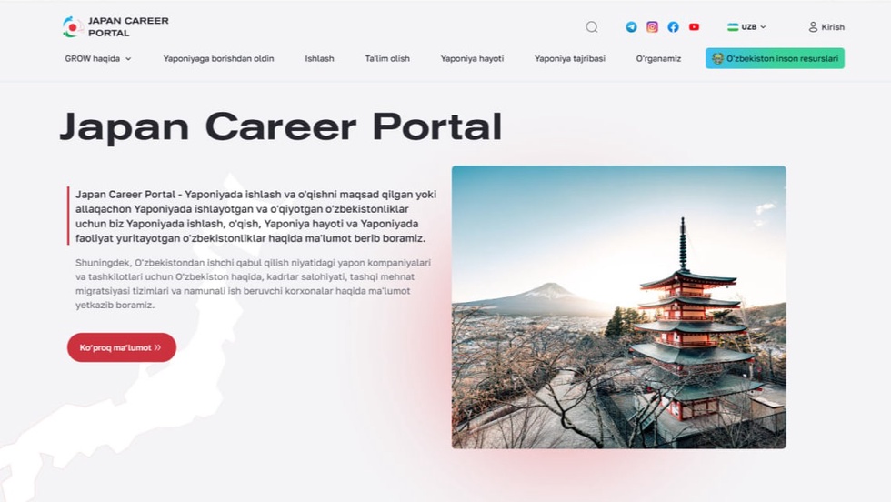 “Japan Career Portal” Ўзбекистон фуқароларига Японияда меҳнат миграцияси, таълим ва яшаш имкониятлари ҳақида ишончли маълумотларни тақдим этувчи универсал платформа саналади.