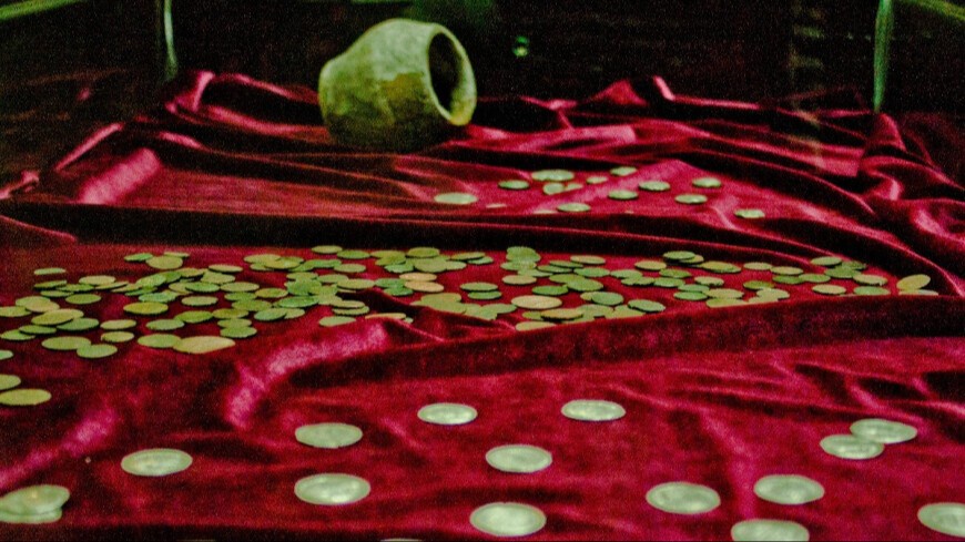 Мутахассислар чуқурлиги 60 сантиметр ва эни тахминан бир метр бўлган майдонни қазишди ва ҳар бири 100 донадан иборат 1060 даста тангаларни топишди. Тангалар сомон арқон билан боғланган.