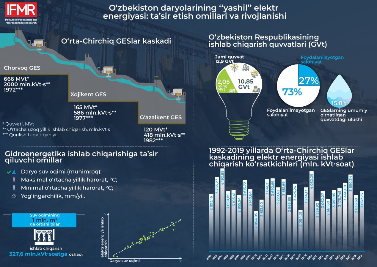 Прогнозлаштириш ва макроиқтисодий тадқиқотлар институти экспертлари иқлим ўзгариши шароитида Ўзбекистонда дарё сув ресурсларидан фойдаланган ҳолда “яшил” электр энергиясини ишлаб чиқаришга таъсир этувчи омилларни ўрганди. Ушбу тадқиқот доирасида гидроэлектр станцияларида электр энергиясини барқарор ишлаб чиқаришни ишончли режалаштиришда муҳим аҳамиятга эга омилларни аниқлаш мақсадида Ўрта Чирчиқ гидроэлектр станциялари каскади мисолида корреляция ва регрессия таҳлили амалга оширилди.