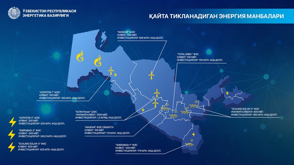 — Яна бир эътиборли жиҳати, ҳозир Бухоро вилоятининг Ғиждувон ва Пешку туманларида ҳар бири 500 МВт қувватга эга шамол электр станцияларини бунёд этиш лойиҳаси бўйича “АCWА Power” билан келишув имзоланиш босқичида турибди, — дейди Шерзод Ходжаев. — Унда тўғридан-тўғри инвестициялар ҳажми 1,3 миллиард АҚШ долларини ташкил этади. Янги иншоотлар 2023-2024 йиллардан эътиборан ишлай бошлайди.
