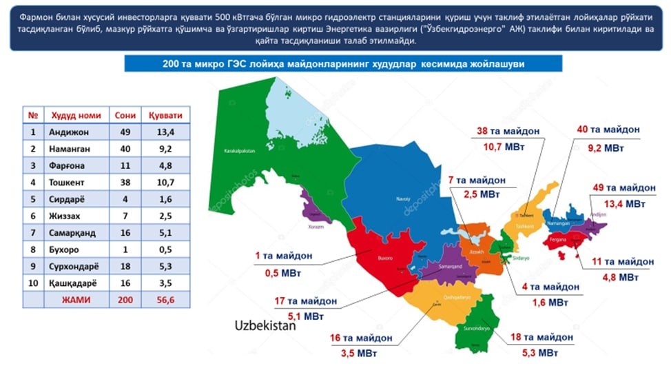 “Ўзбекгидроэнерго” акциядорлик жамияти бўлим бошлиғи Авазбек Зокировнинг қайд этишича, айни кунда хусусий сектор вакилларига, яъни тадбиркорлар томонидан жойларда микро ва кичик ГЭСларни қуриш, экологик жиҳатдан тоза электр энергиясини ишлаб чиқариш учун кенг имконият ҳамда зарурий шароитлар яратилмоқда. Хусусан, мазкур фармоннинг 3-иловасига мувофиқ тасдиқланган “Хусусий инвесторларга қуввати 500 кВтгача бўлган микро гидроэлектрстанцияларини қуриш учун таклиф этилаётган лойиҳалар (майдонлар) рўйхати” “Ўзбекгидроэнерго” АЖ, “Гидропроект” АЖ, Сув хўжалиги вазирлиги ҳамда аҳоли ва тадбиркорлар томонидан маълум қилинган лойиҳа майдонларига чиқиб ўрганиш ишлари олиб борилган ҳолда шакиллантирилди. Лекин бу шу билан янги микро гидростанциялар қуриш тўхтатилди, дегани эмас. Талаб ва таклифга қараб лойиҳа майдонлари ортиб боради.