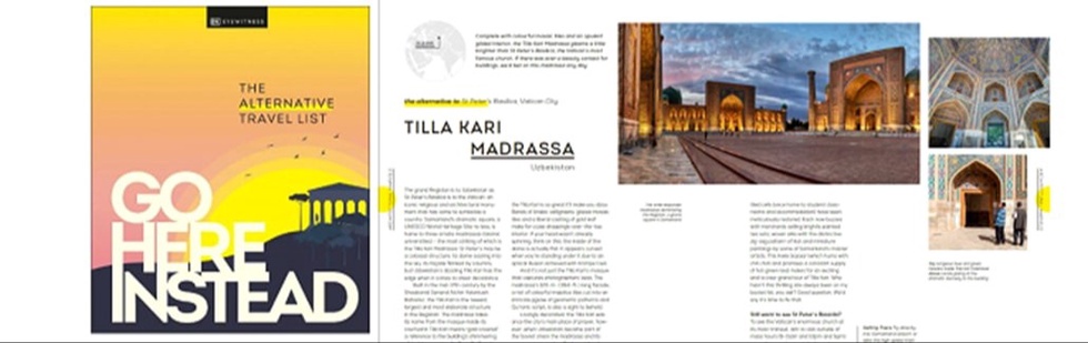 Ушбу қўлланмада Ўзбекистон сайёҳлик брендининг Буюк Британиядаги элчиси Софи Ибботсоннинг машҳур Регистон майдонида жойлашган ва ЮНЕСКОнинг Бутунжаҳон мероси рўйхатидан жой олган Самарқанднинг учта рамзий диний ва меъморий ёдгорликларидан бири -  Тилла Кори мадрасаси ҳақидаги мақоласи ҳам ўрин олган.