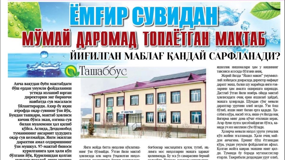 Бундан ташқари, мактаб ҳовлиси кичик бўлса экан, озгина сув билан муаммони ҳал қилиб қўйса. Аслида, Деҳқонобод туманининг аксарият ҳудудига оқар сув келмайди. Янги экилган дарахтни амал олдиришнинг ўзи мушкул. 97-мактаб биноси қурилганига ҳам ҳали кўп бўлгани йўқ. Қурилишдан қолган ҳудудни тозалаб, ерни экишга тайёрлаб олишнинг ўзи бўлмади. Бунинг учун катта меҳнат сарфланди.