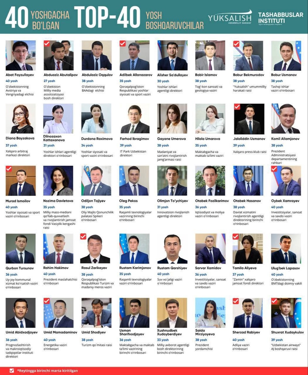 “Юксалиш” умуммиллий ҳаракати Ижтимоий ва иқтисодий ташаббуслар институти билан ҳамкорликда 2019 йилдан буён Ўзбекистоннинг 40 ёшгача бўлган истиқболли ёш раҳбар кадрлари рейтингини эълон қилиб келмоқда.