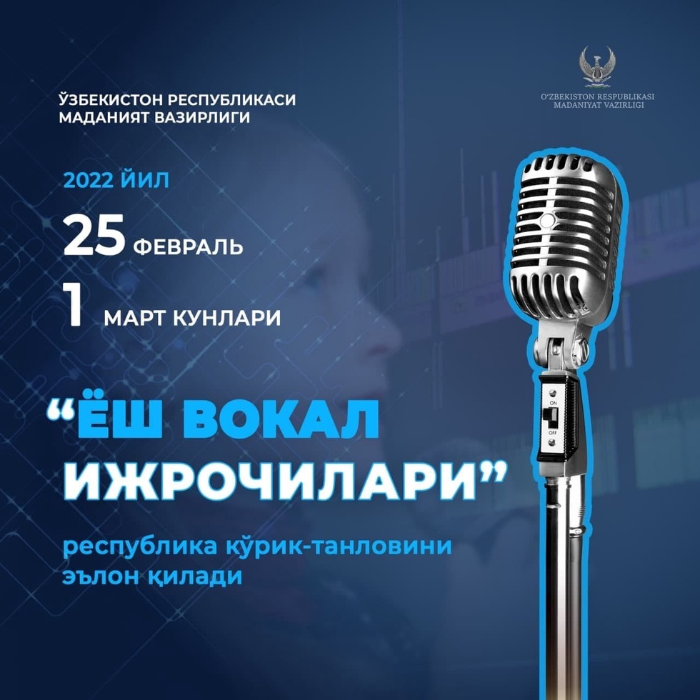 Опера санъатини янада юксалтириш, моҳир ижрочиларни кашф этиш, миллий санъатимизни дунё саҳналарига олиб чиқиш, иқтидорли ёшларни рағбатлантириш ҳамда уларнинг ижодини кенг тарғиб қилиш мақсадида Ўзбекистон Республикаси Маданият вазирлиги жорий йилнинг 25 февраль 1 март кунлари “Ёш вокал ижрочилари” республика кўрик-танловини эълон қилади.