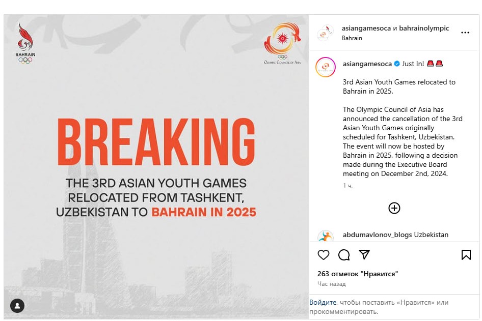 Бу ҳақда Осиё Олимпия кенгаши Instagram саҳифасида эълон қилди.