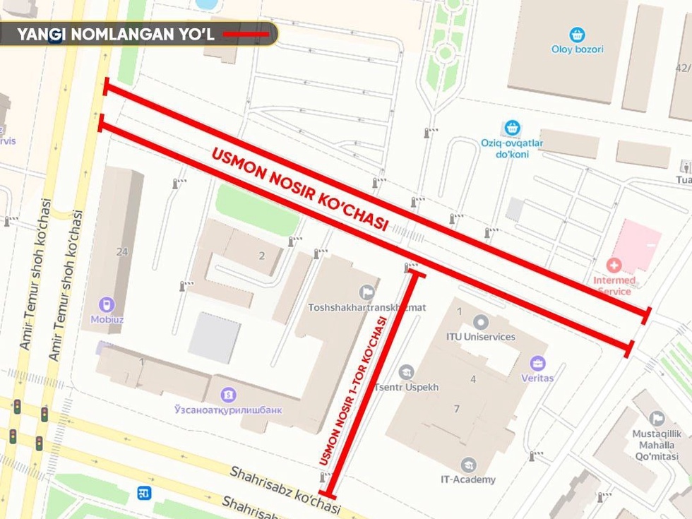 Шунингдек, ушбу кўчага туташ номсиз кўчага Усмон Носир 1-тор кўчаси номи берилди. Бу ҳақда Тошкент шаҳар ҳокимлиги маълум қилди.