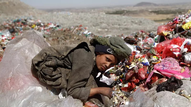 Сана шаҳри яқинидаги чиқиндихонада юк машинаси турли ахлатларга тўла қопларни чиқинди билан қопланган улкан денгизга ташламоқда.