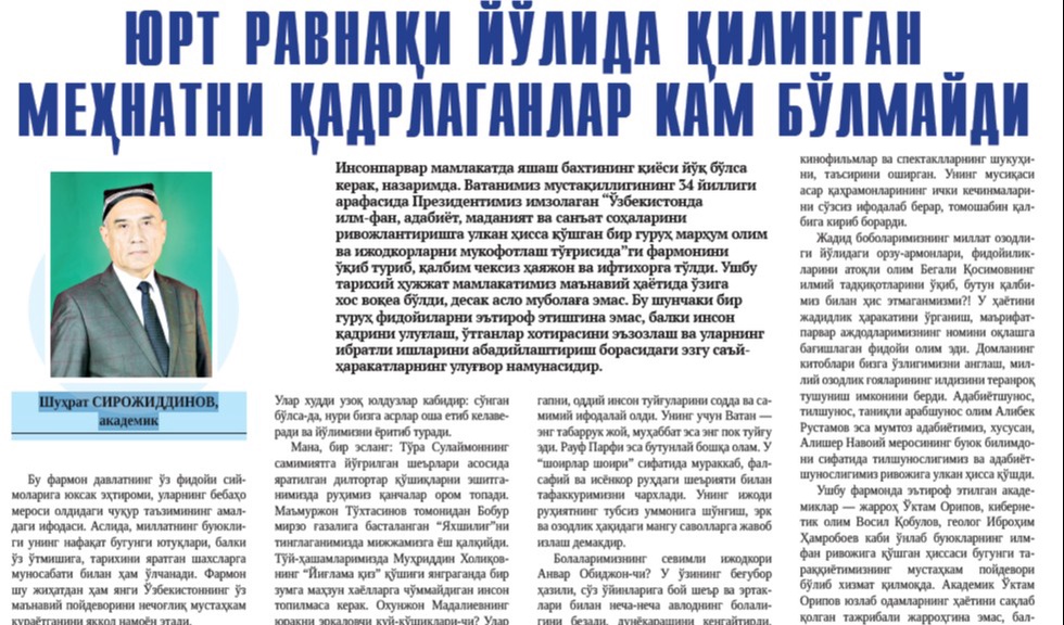 Ватанимиз мустақиллигининг 34 йиллиги арафасида Президентимиз имзолаган “Ўзбекистонда илм-фан, адабиёт, маданият ва санъат соҳаларини ривожлантиришга улкан ҳисса қўшган бир гуруҳ марҳум олим ва ижодкорларни мукофотлаш тўғрисида”ги фармонини ўқиб туриб, қалбим чексиз ҳаяжон ва ифтихорга тўлди. Ушбу тарихий ҳужжат мамлакатимиз маънавий ҳаётида ўзига хос воқеа бўлди, десак асло муболаға эмас. Бу шунчаки бир гуруҳ фидойиларни эътироф этишгина эмас, балки инсон қадрини улуғлаш, ўтганлар хотирасини эъзозлаш ва уларнинг ибратли ишларини абадийлаштириш борасидаги эзгу саъй-ҳаракатларнинг улуғвор намунасидир.