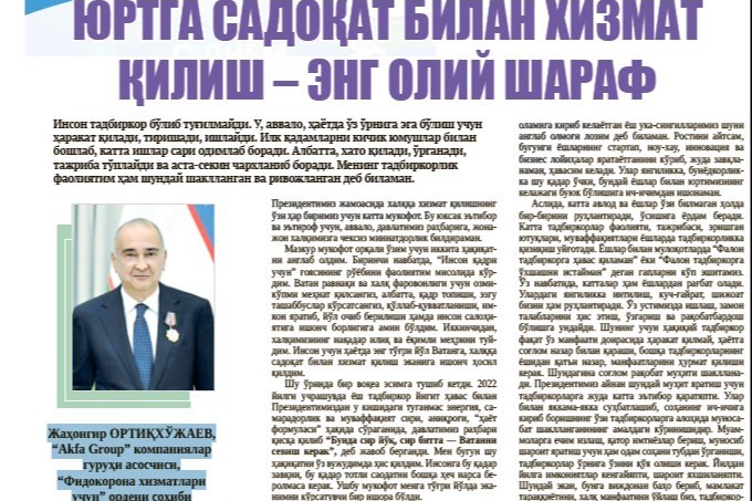 Давлатимиз раҳбари шу йил 20 август куни тадбиркорлар билан учрашувда кўксимга таққан орден тадбиркорлик фаолиятимда ҳали кўп янгиликлар қилишим кераклигига бир ишора бўлди, десам муболаға бўлмайди. Насиб этса, бор тажриба ва салоҳиятимиз, куч-ғайратимизни иқтисодиётимиз ривожи, халқимиз манфаати учун сарфлаймиз. Ростини айтсам, бу мукофот нафақат мен, балки оилам, тадбиркорлик фаолиятимда ёнимда елкама-елка туриб меҳнат қилаётган дўстларим, ҳамроҳларим ва бутун жамоам учун ҳам жуда катта қувонч, чинакам рағбат бўлди. Аслида, шундай тинч-осойишта юртда, тараққиёт сари дадил одимлаётган, инсон қадри юксалаётган мамлакатда яшаш, тадбиркорларни халқнинг таянчи деб биладиган, бизни қалби билан тинглайдиган, тушунадиган ва юксак марралар сари руҳлантира оладиган Президентимиз жамоасида халққа хизмат қилишнинг ўзи ҳар биримиз учун катта мукофот. Бу юксак эътибор ва эътироф учун, аввало, давлатимиз раҳбарига, жонажон халқимизга чексиз миннатдорлик билдираман.