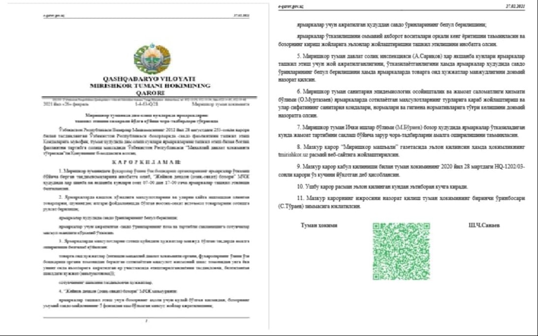Бугун Қашқадарё вилоят ҳокимидан сўнг нафақат вилоятда, юртимиздаги барча туманлар ичида Миришкор туманида биринчи бўлиб, Адлия бўлимидан ҳуқуқий экспертизадан ўтказган ҳолда, ҳеч қандай қоғозларсиз, «Э-қарор» электрон тизими орқали туман ҳокимининг "Миришкор туманида дам олиш кунлари ярмаркаларни ташкил этишни самарали йўлга қўйиш чора-тадбирлари тўғрисида"ги норматив тусдаги қарори қабул қилинди.