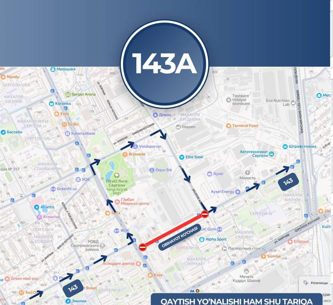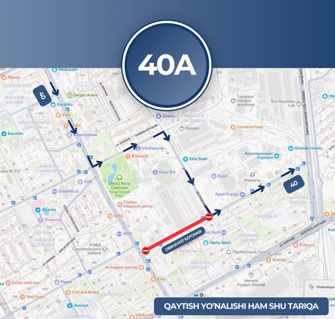 • маршруты № 40 и № 143 будут временно перенаправлены по улицам Янги Сергели йўли → Сугдиёна → Жалойир → Обихает (незакрытая часть).