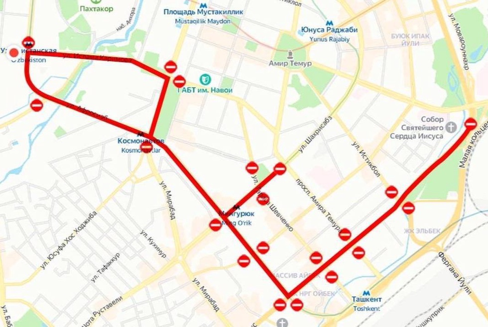 - улицы Ойбекаа, Нукусская и Абдуллы Кадыри - от пересечения с улицей Афросиаб до пересечения с улицей Ислама Каримова.