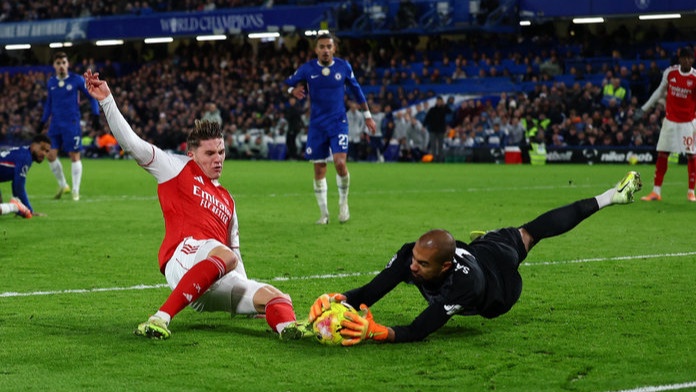 Под занавес тайма «канониры» убежали в контратаку, но удар Габриэля Мартинелли с паса Деклана Райса пришелся не в угол ворота, а близко к Роберту Санчесу, он отразил рукой в падении, затем накрыл. Отметим пас из глубины от Эзе на Мартинелли, тот покатил на Райса, получил обратно и нанес удар. Все правильно, но удар чуточку не получился.