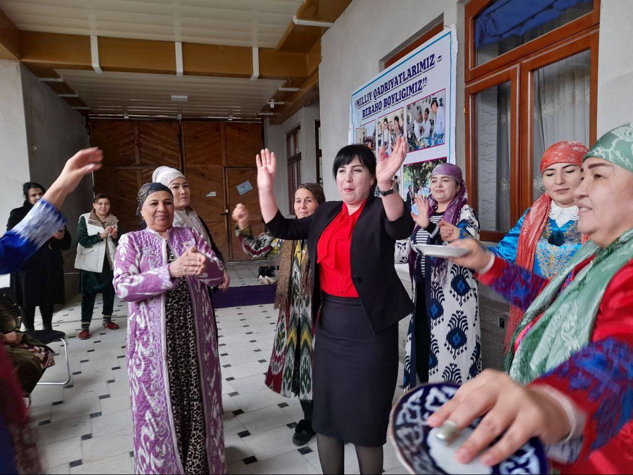Говорят, что благоустройство начинается с души. Вокруг созидательных целей жителей махалли объединяют духовно-просветительские и культурные мероприятия. И в этом активны женщины навбахорского схода граждан. Группа исполнителей лапаров (песни национального фольклора), которую организовали местные активистки, выступили перед земляками с концертной программой. А умелые невестки встречали гостей вкуснейшими кондитерскими изделиями, приготовленными своими руками.