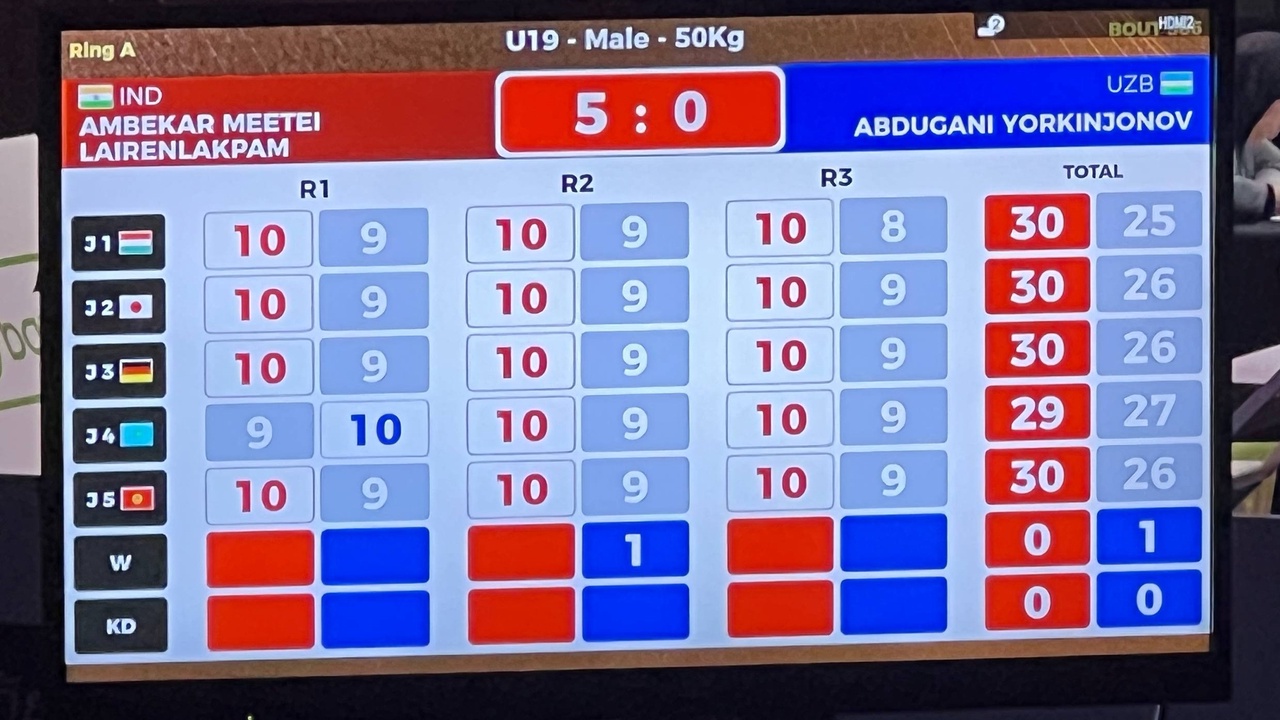 Трое из четверых наших парней вышли в финал. Легковес Абдугани Ёркинжонов (-50 кг), радовавший нокаутами в первом раунде в первых кругах, в полуфинале единогласным решением проиграл 0:5 Амбекару Меетеи из Индии. Зато Сардорбек Бахромхужаев (-85 кг) уверенно переиграл грузина Зураба Оболадзе, Сухроб Рахматуллаев (-75 кг) не оставил ни единого шанса Георгию Битиеву из Новой Зеландии, а тяжеловес Асадбек Султонбоев уже в первом раунде отправил в технический нокаут Союнали Овезгелдиева из соседнего Туркменистана.