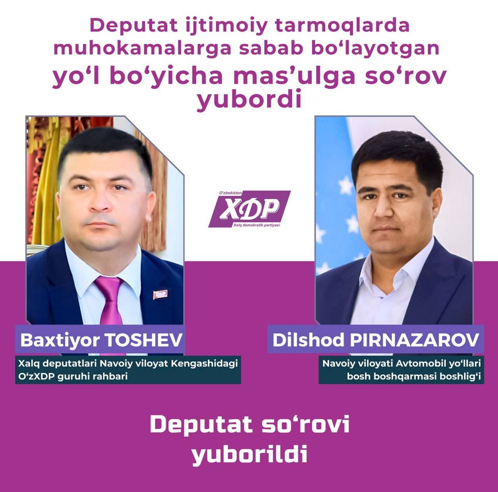 Депутат направил запрос начальнику Главного территориального управления по автомобильным дорогам Навоийской области Дильшоду Пирназарову с просьбой дать обоснованное разъяснение о сроках асфальтирования дороги.