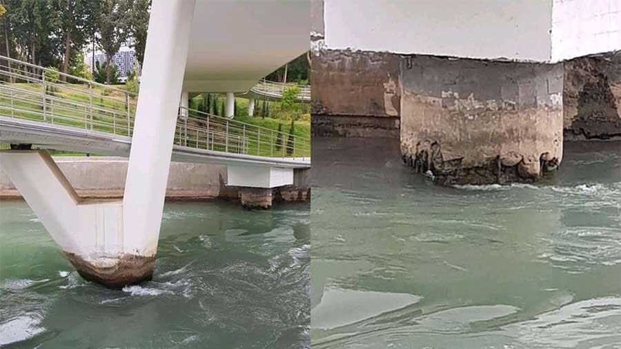 На представленных фотографиях под насадкой опоры видно именно забетонированную скважину буронабивной сваи. Согласно технологии строительства при размещении опоры по высоте был учтен максимальный уровень воды в канале. При этом была выполнена армированная отделка буронабивной сваи, которая, к слову, не является конструктивным элементом опоры и не влияет на несущую способность опоры. Она предназначена лишь для придания архитектурно-эстетического вида. Данная отделка была выполнена из расчета минимального уровня воды. В этом сезоне уровень воды заметно понизился ниже минимального, в результате обнажилось тело бетонного столба, который имеет неровную поверхность. В связи с вышеизложенным подчеркнём, что данный пешеходный мост не представляет опасности и находится в полном исправном, рабочем состоянии, сообщает информационно-аналитический медиа центр.