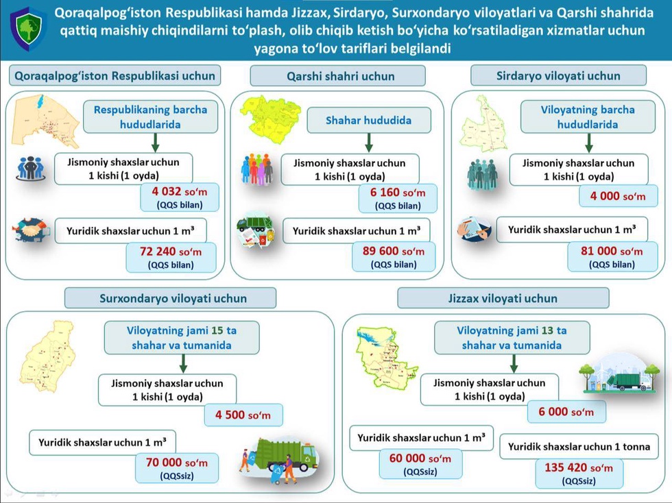 Для информации: в настоящее время принимаются меры по установлению единых тарифов оплаты за оказываемые услуги по сбору и вывозу ТБО в других регионах нашей республики. Ранее были установлены единые тарифы оплаты за оказываемые услуги по сбору и вывозу твердых бытовых отходов в городе Ташкенте, Бухарской, Наманганской, Ташкентской, Самаркандской, Ферганской и Андижанской областях.