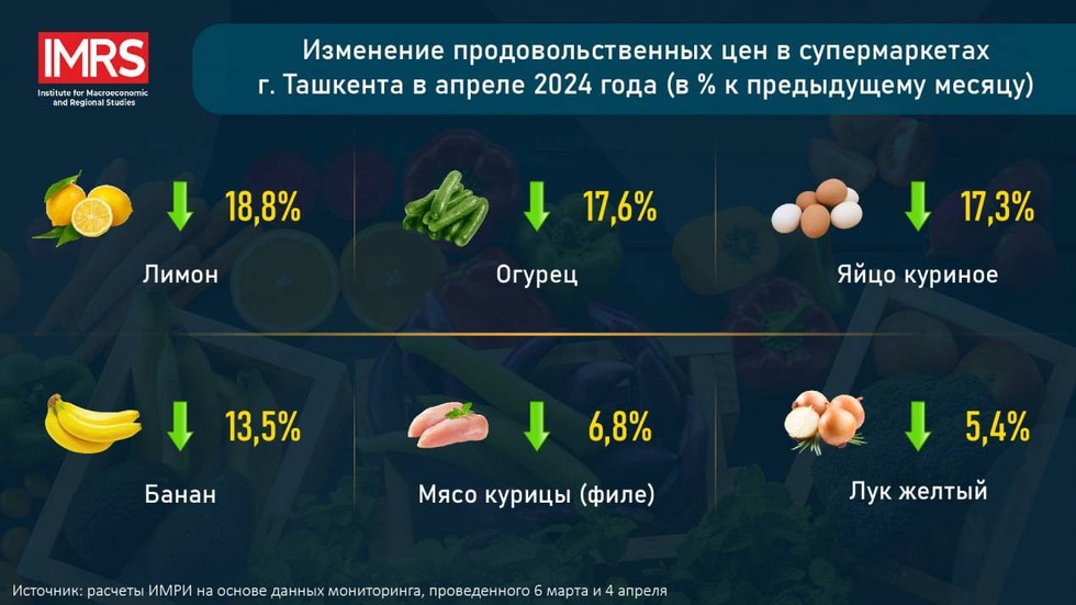 Результаты мониторинга показали, что по 6 позициям минимальные цены снизились в сравнении с предыдущим месяцем*. Снижение цен на лимон составило 18,8%, огурец - 17,6%, яйцо куриное - 17,3%, банан - 13,5%, мясо курицы (филе) - 6,8%, лук желтый - 5,4%.