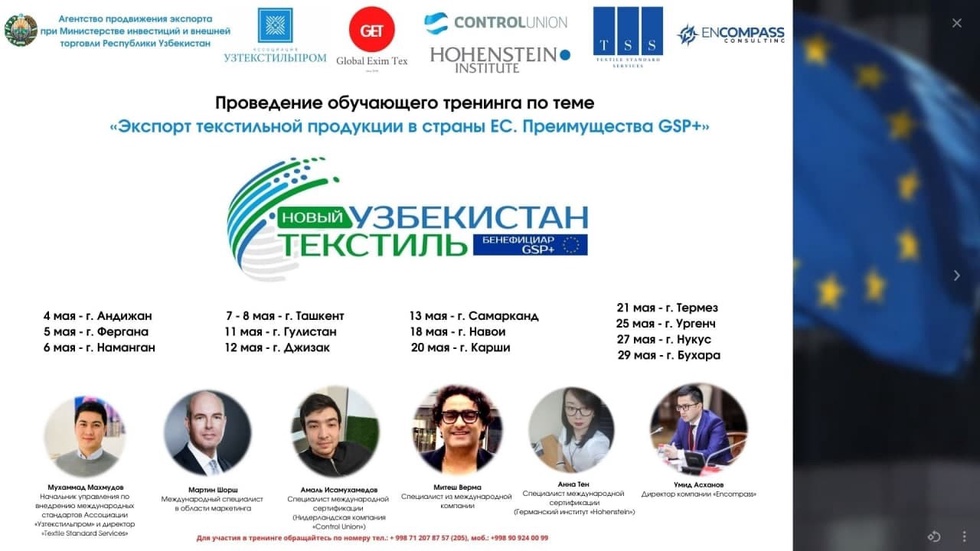 Ассоциация «Узтекстильпром» совместно с Агентством продвижения экспорта проведет обучающие тренинги по теме «Экспорт текстильной продукции в страны ЕС: преимущества GSP+» в регионах Республики Узбекистан в мае месяце текущего года с привлечением международных специалистов в области маркетинга и сертификации.