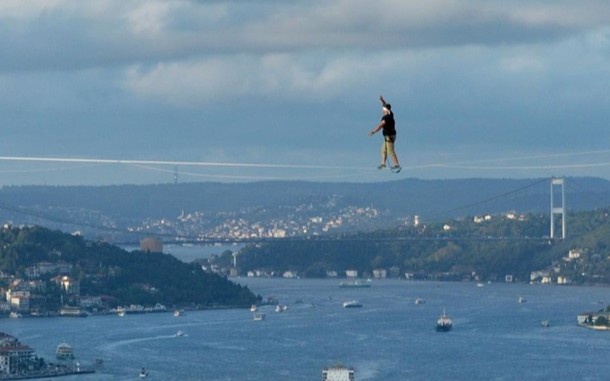Спортсмен прошел по канату длиной почти 1,1 тыс. м над Босфорским проливом. Веревку натянули между опорами Босфорского моста на высоте 165 м над землей.