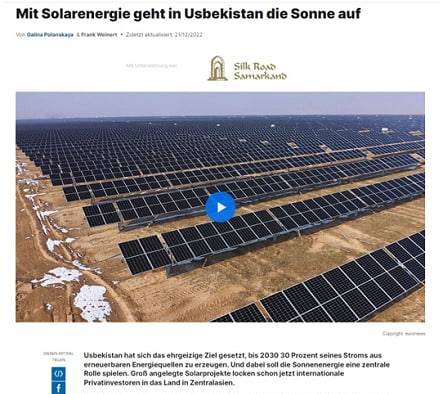 «Узбекистан поставил перед собой амбициозную цель - к 2030 году вырабатывать 30 процентов электроэнергии из возобновляемых источников, - говорится в публикации. - И одну из решающих ролей здесь призвана сыграть энергия солнца. Сегодня масштабные проекты в сфере солнечной энергетики привлекают в Узбекистан международных частных инвесторов».