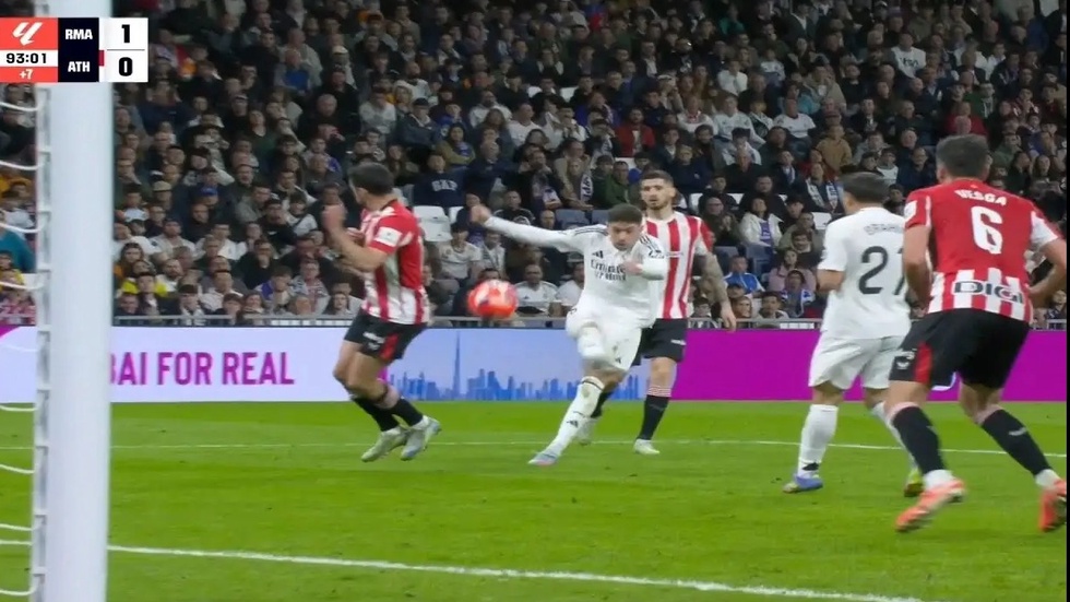 В общем, гол назревал. И если дальний удар Вальверде смог отразить Унаи Симон, то вроде неудачная попытка Диаса обернулась отскоком к Вальверде. Федерико принял мяч одним движением, тот подскочил удобно для удара слету, Вальверде влет положил в верхний угол ворот без шансов для Симона.